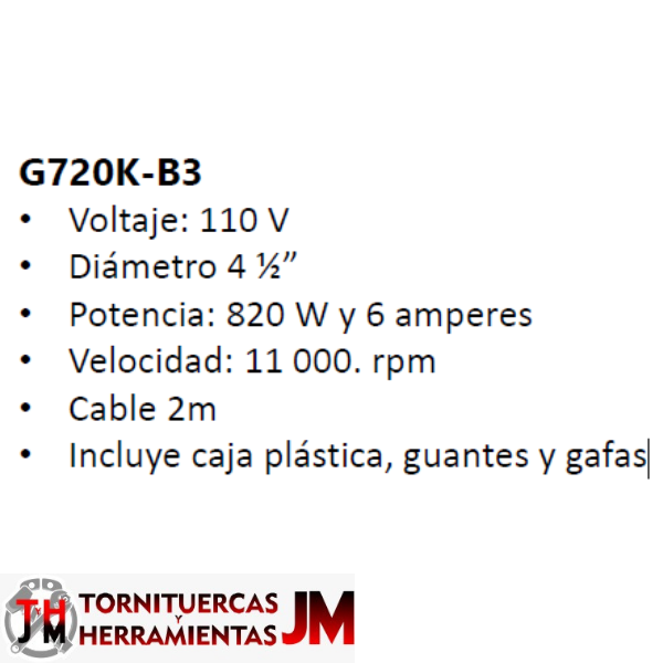 Recuerde que las características y el funcionamiento específico pueden variar según el modelo y la marca de la pulidora G720K. Siempre es aconsejable seguir las indicaciones del fabricante para un uso seguro y eficaz de la herramienta.